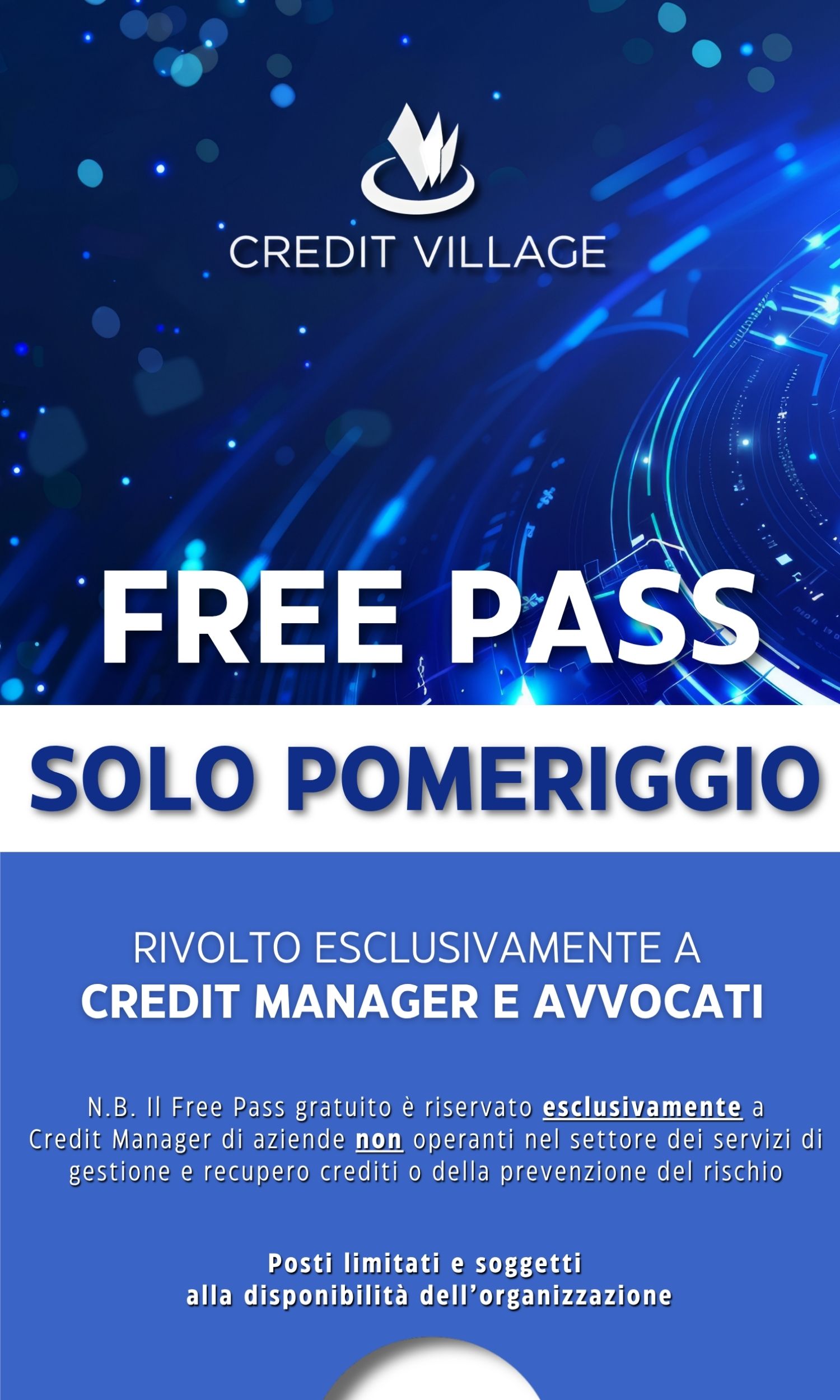 N.B. Il Free Pass gratuito è riservato esclusivamente a Credit Manager di aziende non operanti nel settore dei servizi di gestione e recupero crediti o della prevenzione del rischio
